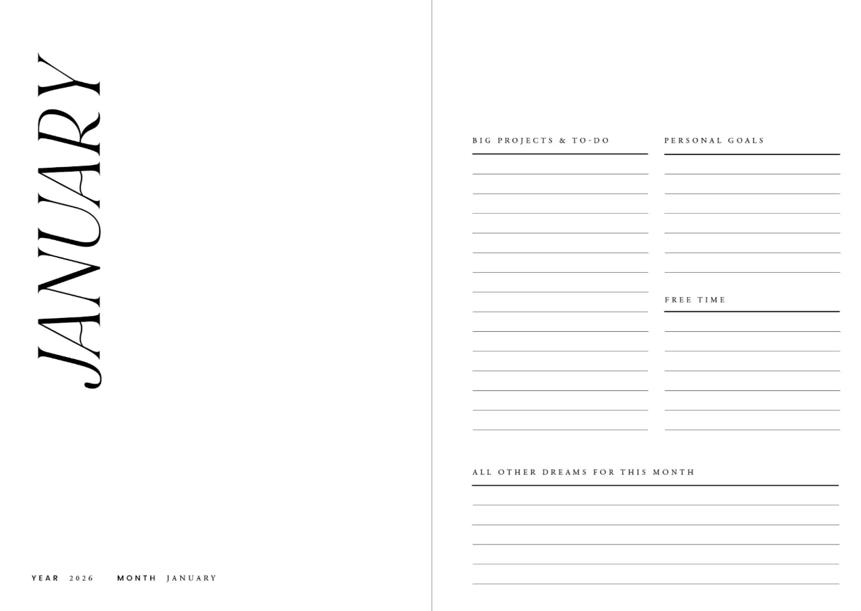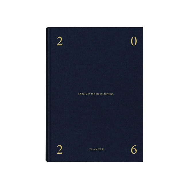 Cozy Planner 2026 Night sky on kovakantinen kauniilla tummansinisellä pellavakankaalla ja kultaisilla yksityiskohdilla viimeistelty kalenteri. Kalenterin sisäsivut ovat mustavalkoisia ja viimeistelty minimalistisen tyylikkäästi. Yksityiskohtana on myös kullanvärinen kankainen kirjanmerkkinauha.